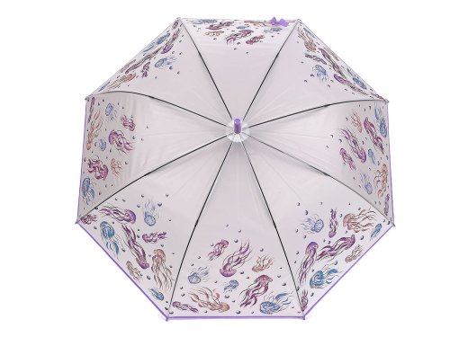 Priesvitný dáždnik s farebnou potlačou pristane dievčatám aj ženám. Dáždnik je vystreľovací, konštrukciu má z kovového drôtu a pružných lamiel, tvorí osem polí. Vďaka nim je veľmi pevný, neohne sa ani za najväčšieho nečasu. Klasická tyč je zakončená pevnou rukoväťou. Hĺbka dáždnika je 27 cm.