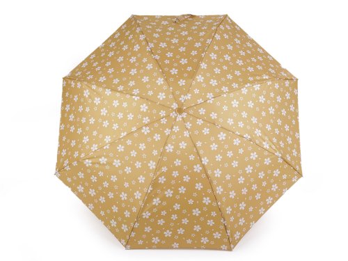 Dámsky skladací dáždnik [s kvetmi]. Vďaka hliníkovej konštrukcii a malej veľkosti je ľahký a skladný, pohodlne sa vám zmestí do kabelky. Obstojí aj v silnom vetre, kovová konštrukcia kombinovaná s pružnými lamelami zaisťuje vysokú pevnosť a stabilitu. Dáždnik je zložený z ôsmich polí. UV filter vás ochráni pred slnečným žiarením. Rukoväť dáždnika je plastová, opatrená pútkom. Súčasťou dáždnika je ochranný obal. Hĺbka dáždnika je 20 cm. Celková dĺžka je 55 cm. Dĺžka zloženého dáždnika je 18 cm.