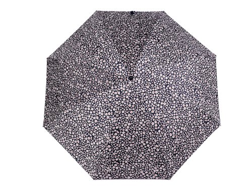 Dámsky skladací dáždnik s potlačou [kvetov]. Dáždnik je veľmi skladný - zložený meria iba [18-19 ]cm, pohodlne sa zmestí do kabelky. Konštrukcia je tvorená ôsmimi poľami. Obstojí aj v silnom vetre, pružné lamely zaisťujú vysokú pevnosť a stabilitu. UV filter vás ochráni pred slnečným žiarením. Rukoväť dáždnika je plastová, opatrená pútkom. Súčasťou dáždnika je ochranný obal. Hĺbka dáždnika je 20 cm. Celková dĺžka je 55 cm. Dĺžka zloženého dáždnika je [18-19 cm.]