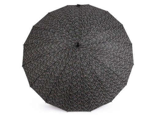 Veľký dámsky vystreľovací dáždnik so vzorovaným poťahom drobných kvetov vás spoľahlivo ochráni pred nepriazňou počasia. Skladá sa zo 16 výsečí, vďaka ktorým sa dáždnik radí medzi luxusné kúsky. Konštrukcia je vyrobená z pružných lamiel zaisťujúcich vysokú pevnosť a stabilitu. UV filter vás ochráni pred slnečným žiarením. Dáždnik má klasickú tyč zakončenú pevnou rukoväťou. Hĺbka dáždnika je 26 cm.