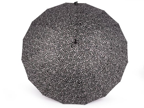 Veľký dámsky vystreľovací dáždnik so vzorovaným poťahom drobných kvetov vás spoľahlivo ochráni pred nepriazňou počasia. Skladá sa zo 16 výsečí, vďaka ktorým sa dáždnik radí medzi luxusné kúsky. Konštrukcia je vyrobená z pružných lamiel zaisťujúcich vysokú pevnosť a stabilitu. UV filter vás ochráni pred slnečným žiarením. Dáždnik má klasickú tyč zakončenú pevnou rukoväťou. Hĺbka dáždnika je 26 cm.