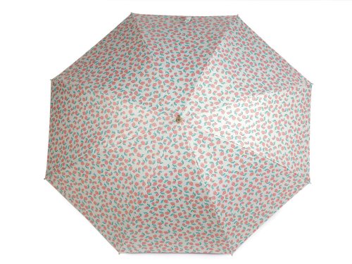 Veľký dámsky dáždnik s potlačou malých kvetov je vystreľovací, konštrukciu má z kovového drôtu a pružných lamiel, ktoré tvoria osem polí.
