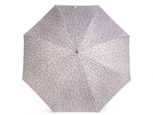 Veľký dámsky dáždnik s potlačou kvetov je vystreľovací, konštrukciu má z kovového drôtu a pružných lamiel, ktoré tvoria osem polí. Vďaka nim je veľmi pevný, neohne sa ani za najväčšieho nečasu. UV filter vás ochráni pred slnečným žiarením. Klasická tyč je zakončená pevnou rukoväťou z eko kože. Dolná strana poťahu je čierna. Hĺbka dáždnika je 24 cm.