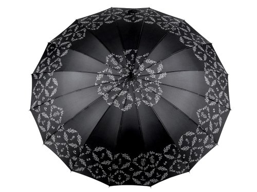 Dámsky vystreľovací dáždnik s jemným vzorom vetvičiek a kvetov vás spoľahlivo ochráni pred nepriazňou počasia. Skladá sa zo 16 výsečí, vďaka ktorým sa dáždnik radí medzi luxusné kúsky. Konštrukcia je vyrobená z kovových drôtov a pružných lamiel zaisťujúcich vysokú pevnosť a stabilitu, dáždnik sa neohne ani za najväčšieho nečasu. Má klasickú tyč zakončenú pevnou rukoväťou. Hĺbka dáždnika je 27 cm.