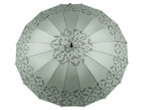 Dámsky vystreľovací dáždnik s jemným vzorom vetvičiek a kvetov vás spoľahlivo ochráni pred nepriazňou počasia. Skladá sa zo 16 výsečí, vďaka ktorým sa dáždnik radí medzi luxusné kúsky. Konštrukcia je vyrobená z kovových drôtov a pružných lamiel zaisťujúcich vysokú pevnosť a stabilitu, dáždnik sa neohne ani za najväčšieho nečasu. Má klasickú tyč zakončenú pevnou rukoväťou. Hĺbka dáždnika je 27 cm.