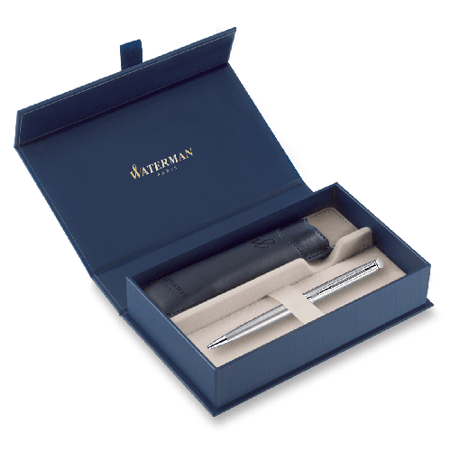 Darčeková kazeta obsahuje:, * guličkové pero Waterman Hémisphère Stainless Steel CT , * modré PU puzdro Waterman, * voucher Akadémia písania