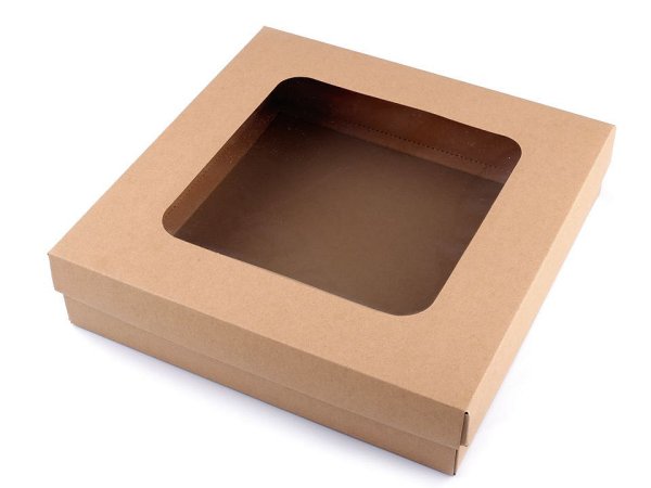 Štvorcová papierová krabica má výrez vo veku z priehľadnej fólie. Využijete ju na balenie darčekov, šatiek, uloženie baniek a pod. Môžete si ju aj dozdobiť podľa svojho vkusu. Škatuľu dodávame v rozloženom stave (horné veko - 47 x 47 cm, spodná časť krabice - 60 x 60 cm). Zložíte si ju jednoducho podľa vyznačených ohýbacích krajov. Rozmer priehľadu je 20 x 20 cm. [Pripravili sme pre vás foto návod na skladanie krabičky.]