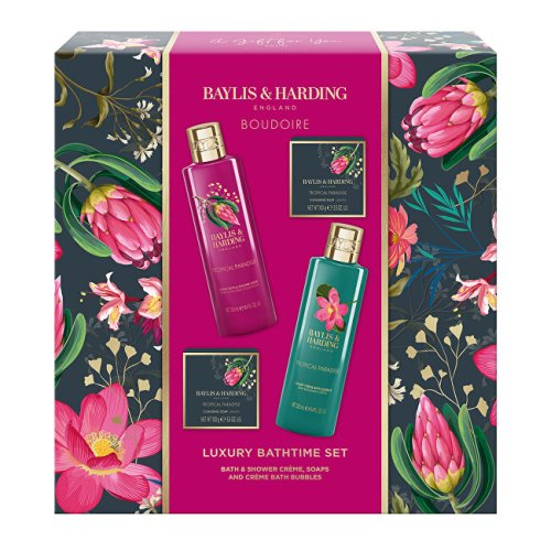 Táto nádherná darčeková sada ukrýva 4 ošetrujúce produkty pre pokožku celého tela. Pripravte sa na jedinečný zážitok a rozmaznávajte svoju pokožku pomocou tejto exkluzívnej kolekcie produktov s vôňou banánu, broskyne a pomarančových kvetov. Obsahuje zamatovo jemný sprchový a kúpeľový krém, penu do kúpeľa a tuhé mydlo na dokonalý pocit čistoty. Trendy kolekcia Boudoire - Tropical Paradise prináša exotický kvetinový design s moderným nádychom a štipkou luxusu. Odvážna paleta fuchsiovej ružovej a smaragdovo zelenej je doplnená zlatými detailmi, ktoré celému radu dodávajú výnimočný charakter. Ošetrujúce produkty a nádherné darčekové sady sprevádza tropická vôňa banánu, broskyne a pomarančového kvetu. Vlastnosti: • čistia a starajú sa o pokožku celého tela • s dlhotrvajúcou, tropickou vôňou • pre každodenný umývací rituál • v luxusnom balení Sprchový a kúpeľový krémTento nádherne hladký a bohatý krém je šetrný k pokožke, účinne čistí a vytvára intenzívnu penu, ktorá zanechá pokožku tela hydratovanú a jem. pokožku alebo vlejte do teplého vodného kúpeľa. Vytvorte krémovú penu a dôkladne opláchnite. Pena do kúpeľaVytvára bohatú a krémovú penu, ktorá hydratuje a vyživuje pokožku celého tela. Zanechá ju hebkú, hladkú a príjemne prevoňanú exotickou vôňou. Použitie: Pod prúdom vody vlejte do teplého vodného kúpeľa. Tuhé mydlo Tuhé mydlo odstraňuje nečistoty z pokožky rúk bez nepríjemného vysušovania. Vytvára bohatú penu a zanecháva dlhotrvajúcu vôňu . Použitie: Premiešajte vo vlhkých dlaniach, napeňte a opláchnite. Doplňujúce informácie:• Vegan & Cruelty Free