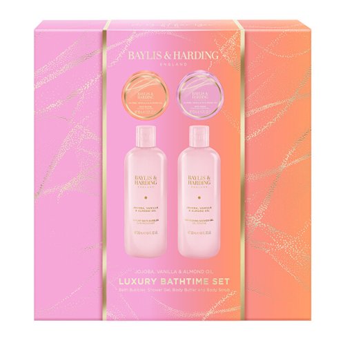 Táto nádherná darčeková sada ukrýva 4 ošetrujúce produkty pre pokožku celého tela. Pripravte sa na jedinečný zážitok a rozmaznávajte svoju pokožku pomocou tejto exkluzívnej kolekcie produktov s vôňou jojoby, vanilky a mandľového oleja. Obsahuje zamatovo jemný sprchový gél, penu do kúpeľa, telový peeling a telové maslo pre dokonalý pocit čistoty a nádherne jemnej a hebkej pokožky. Luxusná kolekcia Jojoba, Vanilla & Almond Oil je prezentovaná metalickými, ombré odtiene pastelovo ružovej a broskyňovej farby s explóziou trblietavých detailov, ktoré spoločne s holografickým baliacim papierom prepožičiavajú kolekcii ojedinelý vzhľad inšpirujúci sa krásou poznania astrológie. Kolekciu sprevádza jemná a zmyselná vôňa vanilky, mandľového oleja a sladkej jojoby. Vlastnosti: • čistia a starajú sa o pokožku celého tela • zanechá hebkú, hladkú a prevoňanú pokožku • s dlhotrvajúcou vôňou jojoby, vanilky a mandlí • pre každodenný ošetrujúci rituál • v luxusnom balení Sprchový gélVoňavý sprchový gél vytvára bohatú penu, šetrne čistí a nevysušuje pokožku. Zanechá ju hebkú, vláčnu a prevoňanú tónmi vanilky, jojoby a mandlí. Použitie: Naneste na vlhkú pokožku, napeňte a opláchnite. Pena do kúpeľaVytvára bohatú a krémovú penu, ktorá hydratuje a vyživuje pokožku celého tela. Zanechá ju hebkú, hladkú a príjemne prevoňanú . Použitie: Pod prúdom vody vlejte do teplého vodného kúpeľa. Telové masloTelové maslo s glycerínom a bambuckým maslom intenzívne hydratuje, vyživuje a regeneruje pokožku celého tela. Svojím ošetrujúcim zložením skvele dopĺňa rad produktov s vôňou jojoby, vanilky a mandľového oleja . Použitie: Po kúpeli naneste na celé telo a dôkladne rozotrite a vmasírujte do pokožky. Telový peelingJemný telový peeling so sladko-orieškovou vôňou šetrne odstraňuje odumreté kožné bunky a zanecháva pokožku hladkú, hebkú a sviežu. Pomáha obnoviť prirodzený vzhľad pokožky a pripravuje ju na ďalšiu starostlivosť. Použitie: Naneste na vlhkú pokožku a jemne masírujte krúživými pohybmi. Potom dôkladne opláchnite. Používajte 1–2× týždenne. Doplňujúce informácie:• Vegan & Cruelty Free