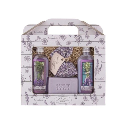 Darčekové balenie levanduľovej kozmetiky La Provence obsahuje krémový sprchový gél 100 ml, olejový kúpeľ 100 ml, toaletné mydlo 100 gv plátenom sáčku a vonné vrecko s bylinkami (levanduľa).