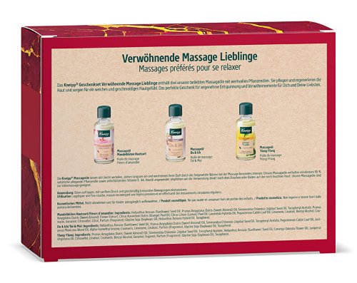 Masážne oleje Kneipp obsahujú účinné látky rastlinného pôvodu, sú bez konzervantov, parafínov, silikónu a minerálnych olejov. Pri masáži uvoľňujú éterické oleje, ktoré pokožku nádherne prevoňajú a zároveň ju blahodárne vyživia. Nezanechávajú mastný film a napriek tomu pokožka po ich použití zostáva dlhodobo vláčna. Pravidelná masáž zlepšuje spánok, odstraňuje únavu a pôsobí proti stresu. Súprava obsahuje: