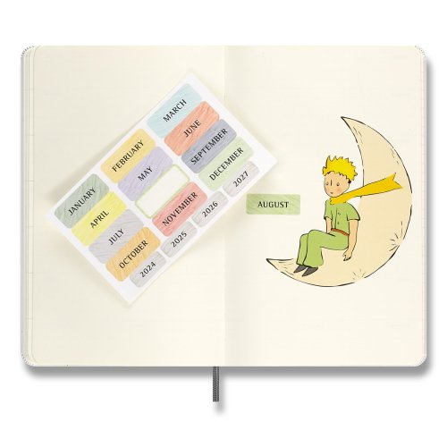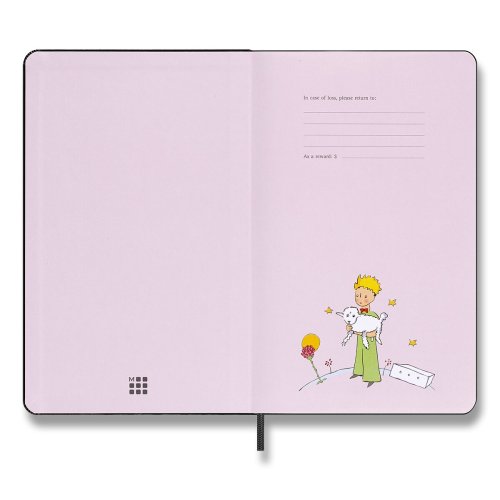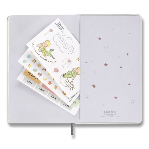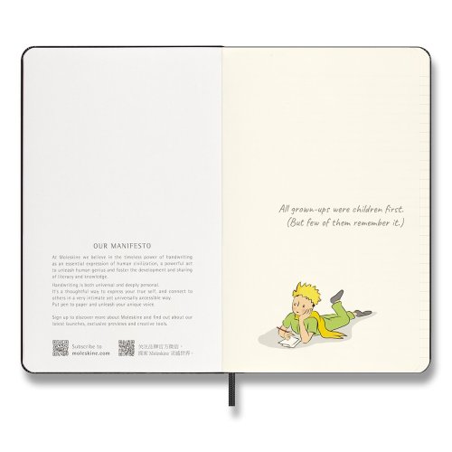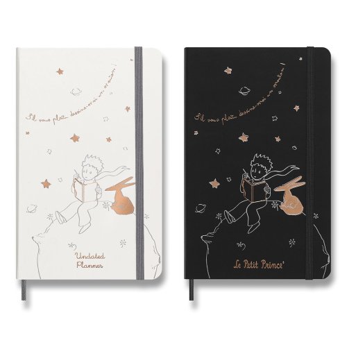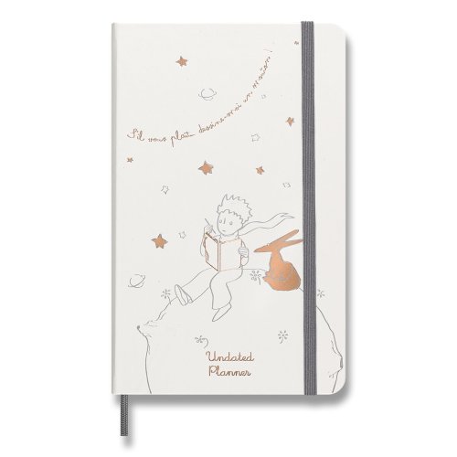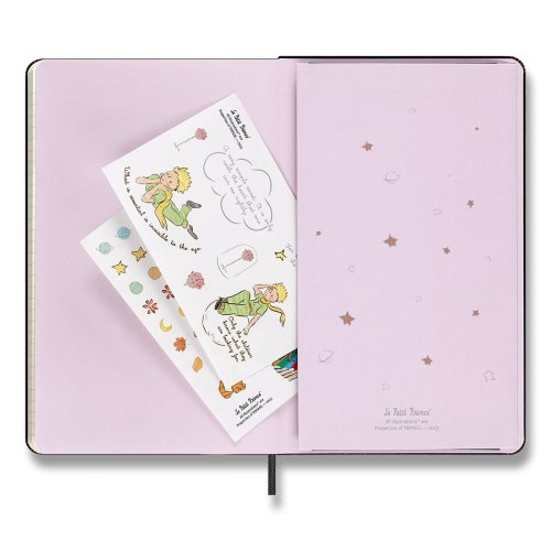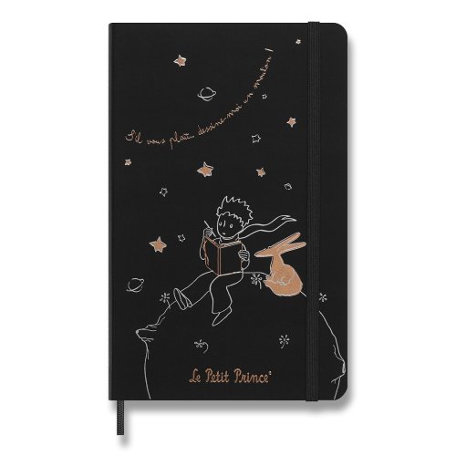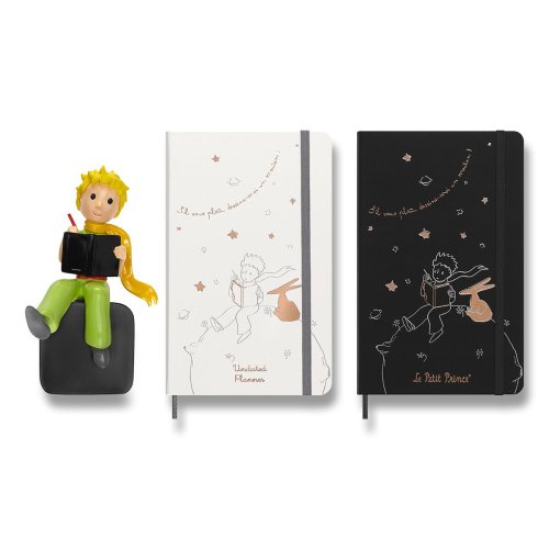 ZÁPISNÍK MOLESKINE - TVRDÉ DOSKY, VEĽKOSŤ L, Zápisník má pevnú, v chrbte šitú väzbu v kartónových doskách. Vnútorná časť, rovnako ako dosky, sú tematicky zdobené prvkami Le Petit Prince. Zápisník obopína pružná páska proti, samovoľnému otváraniu. Obsahuje praktické vnútorné vrecko na vizitky a dokumenty, textilnú záložku a leták s históriou MOLESKINE. Papier s gramážou 100 g/m², neobsahuje kyseliny., ROZMERY: 13 x 21 cm, 88 listov, linajkový, Vrátane tematických samolepiek., Zápisník je v anglickom jazyku. šitú väzbu v kartónových doskách. Vnútorná časť, rovnako ako dosky, sú tematicky zdobené prvkami Le Petit Prince. Diár obopína pružná páska proti, samovoľnému otváraniu. Obsahuje praktické vnútorné vrecko na vizitky a dokumenty, textilnú záložku a leták s históriou MOLESKINE. Mesačný, týždenný a denný prehľad. Papier s gramážou, 100 g/m², neobsahuje kyseliny., ROZMERY: 13 x 21 cm, 120 listov , Vrátane tematických samolepiek., Diár je v anglickom jazyku., , ZBERATEĽSKÁ FIGÚRKA MALÉHO PRINCA, Číslovaná zberateľská figúrka. Figúrka je vysoká 18 cm. , , Diár, zápisník a zberateľská figúrka Malého princa je dodávaný v darčekovom boxe