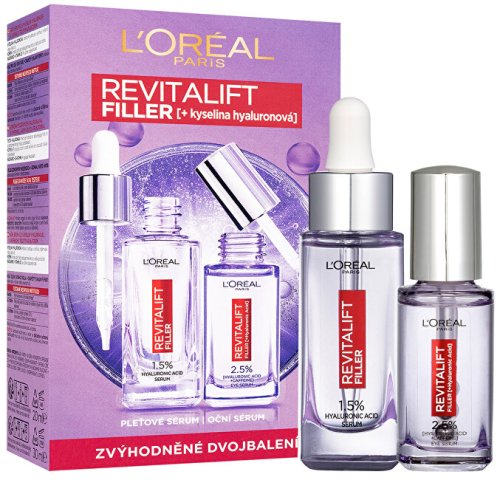 Súprava obsahuje: Sérum proti vráskam s 1,5% čistej kyseliny hyalurónovej Revitalift Filler (Hyaluronic Acid Serum) 30 ml Očné sérum s 2,5% kyselinou hyalurónovou Revitalift Filler (Eye Serum) 20 ml
