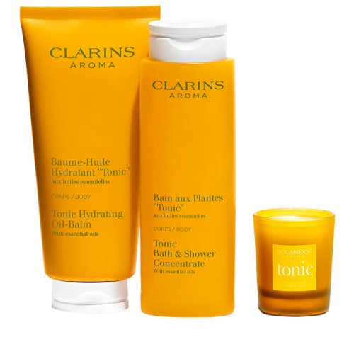 Hydratačný telový balzam (Tonic Hydrating Oil-Balm) 200 ml Tonizačný kúpeľ (Tonic Bath & Shower Concentrate) 200 ml Vonná sviečka Tonic (Scented Candle) 35 g Kozmetická taška 1 ks