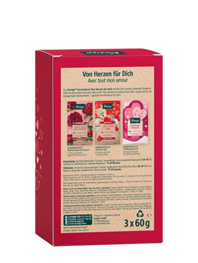 Darčeková sada Kneipp Pro Teba s motívmi srdiečok a veľkým výrezom v tvare srdca skrýva 3 kúpeľové soli s okúzľujúcimi vôňami. Súprava obsahuje: