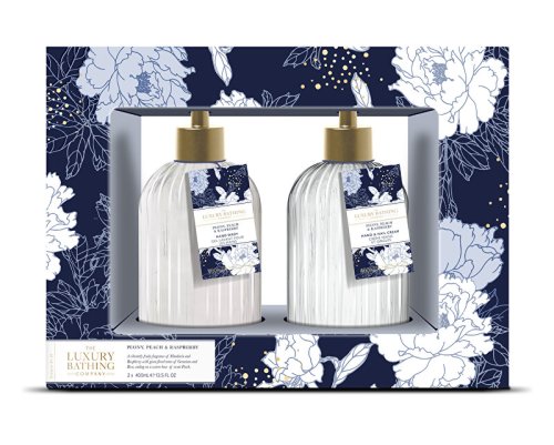 Tekuté mydloJemné mydlo šetrne čistí pokožku bez nepríjemného vysušovania. Zanecháva ruky hebké a príjemne prevoňané. Použitie: Naneste na vlhké ruky, napeňte a dôkladne opláchnite. Krém na rukyVýživné mlieko dodá pokožke potrebnú hydratáciu a úľavu od pocitu suchosti. Zanecháva ju hebkú, vláčnu a príjemne prevoňanú . Použitie: Naneste na suchú a čistú pokožku, vmasírujte, kým sa nevstrebe. Pivonka, Broskyňa & MalinaKvetinová vôňa pivoniek a ruží je doplnená vôňou malín, pomarančov a sladučkých broskýň. Nádherne vyvedené kvety na tmavomodrom podklade dodáva kolekcii elegantný a ženský vzhľad. Neužívajte vnútorne. Vyhnite sa kontaktu s očami, vyhnite sa okoliu očí. Pri akýchkoľvek známkach podráždenie prestaňte používať. Bez parabénov, silikónov a ftalátov Vegánske a Cruelty free