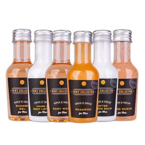 Sprchový gél s vôňou brezy a cédra (Shower Gel) 50 ml Tekuté mydlo s vôňou brezy a cédra (Body Wash) 50 ml Telové mlieko s vôňou brezy a cédra (Hand & Body Lotion) 50 ml Peeling na ruky s vôňou Šampón na vlasy s vôňou brezy a cédra (Shampoo) 50 ml Balzam po holení s vôňou brezy a cédra (After Shave Balm) 50 ml