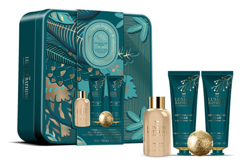 Premeňte čas pre seba na jedinečný zážitok, či už je to luxusný kúpeľ, sprcha alebo hydratácia celého tela. Táto darčeková sada s kúpeľovými a hydratačnými produktmi rozmaznáva vašu pokožku jemnou textúrou s vôňou grapefruitu, hrušky a pomaranča, kvetinovými tónmi a drevitým základom s nádychom vanilky. Zanechá celé telo príjemne prevoňané s výsledkom hladkej a hebkej pokožky. Darčeková kolekcia Sparkling Pear & Nectarine Blossom je svojim dizajnom v odtieňoch zlatej, tyrkysovej a zelenej nápadná a elegantná. Obsahuje produkty starostlivosti o telo vhodné pre ženy vo veku 40+. Typická anglická vôňa ponúka šťavnaté tóny grapefruitu, hrušky a pomaranča miešajúce sa s ružou, čiernymi ríbezľami, kvapkou neroli a fialkou. Drevitý základ mošusu, jantáru a santalového dreva spolu s jemným nádychom vanilky zanecháva dlhotrvajúci dojem. Vlastnosti: • čistia, hydratujú a starajú sa o pokožku celého tela • s dlhotrvajúcou vôňou ovocia a kvetov • dobre sa vstrebávajú do pokožky • na relaxáciu celého tela • balené v štýlovej, darčekovej dóze Aktívne látky: • glycerín - hydratuje a zvláčňuje pokožku Sprchový gélGel šetrne čistí pokožku, zanecháva zatiaľ čo uvoľňuje dlhotrvajúcu vôňu . Použitie: Aplikujte na vlhkú pokožku, vytvorte bohatú penu a potom dôkladne opláchnite. Telový krémVyživujúci krém dodáva pokožke potrebnú hydratáciu a úľavu od pocitu suchosti, zanecháva ju hebkú, vláčnu a príjemne prevoňanú.Použitie : Naneste na suchú a čistú pokožku a vmasírujte kým sa úplne nevstrebe. Krém na rukyKrém na ruky s glycerínom a parafínom intenzívne hydratuje a zvláčňuje pokožku. Chráni ju pred chladom, vetrom a vysúšaním. Použitie: Aplikujte na suché a čisté ruky. Vmasírujte do pokožky, kým sa krém úplne nevstrebe. Šumivé gule do kúpeľaSpríjemnite si kúpeľ s touto šumivou guličkou, ktorá prevonia vodný kúpeľ aj pokožku celého tela a navodí pocit pohody a relaxácie. Použitie: Ponorte do teplého kúpeľa a nechajte rozpustiť. Doplňujúce informácie:• Vegan & Cruelty Free