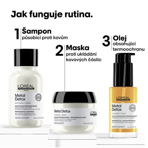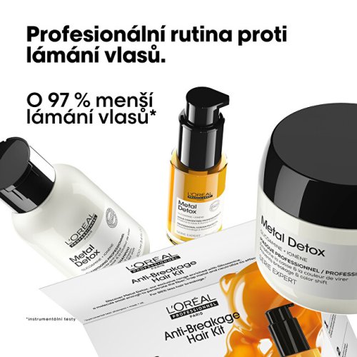 Šampón pre farbené a poškodené vlasy Séria Expert Metal Detox (Professional Shampoo) 100 ml Maska pre farbené a poškodené vlasy Séria Expert Metal Detox (Professional Mask) 75 ml Koncentrovaný olej proti usadzovaniu kovových častíc Metal Detox (Professional Concentra