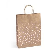 taška z kraftového papiera s ozdobnými ružovými srdiečkami v metalickom prevedení alternatíva igelitových tašiek taška je lepená, má ploché dno, krútené ucho rozmer 33x10x24 cm gramáž 130g/m2 balenie 5 ks