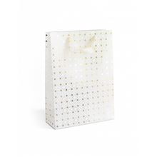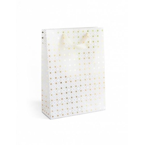Papierová dekoratívna darčeková taška, rýchly pomocník pri balení vašich darčekov Rozmery: veľkosť L - 33 x 10 x 24 cm Farba: biela Motív: zlatý metalický geometrický vzor Počet ks v balení: 5 ks