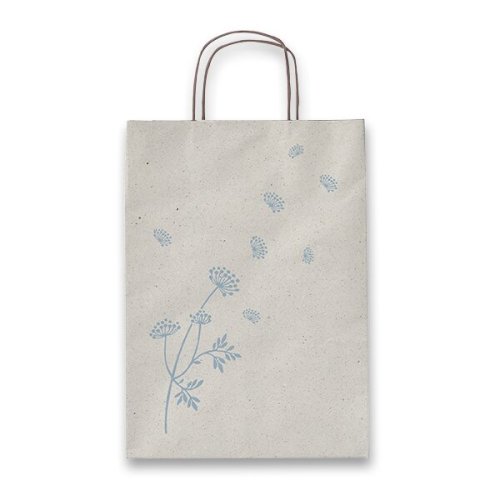 Darčeková papierová taška SADOCH Allegra Carta Erba s atraktívnymi prírodnými motívmi v modrom odtieni. Vyrobená zo 100% recyklovaného bieleho kraftového papiera, ktorý obsahuje z 25% sušené trávne vlákna a zo 75% recyklovaný papier. Na prvý pohľad prírodný charakter a štruktúra papiera sú doplnené ľahkou vôňou sušenej trávy.