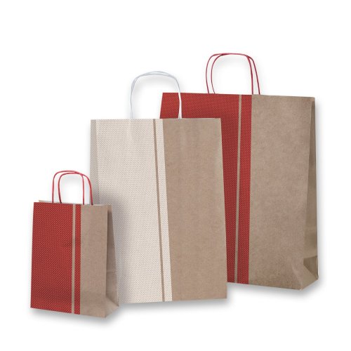 Darčeková papierová taška Sadoch Kraft Red Stripe v atraktívnom dizajne s červenohnedým prevedením. Hnedý kraftový papier z vonkajšej časti az vnútornej časti biely kraftový papier.