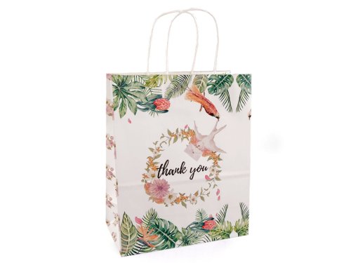 Papierovú darčekovú tašku z oboch strán zdobia obrázky a nápis "thank you". Jej uchá sú krútené a tiež vyrobené z papiera. Taška je vhodná na darovanie darčekov aj na balenie tovaru v predajniach.