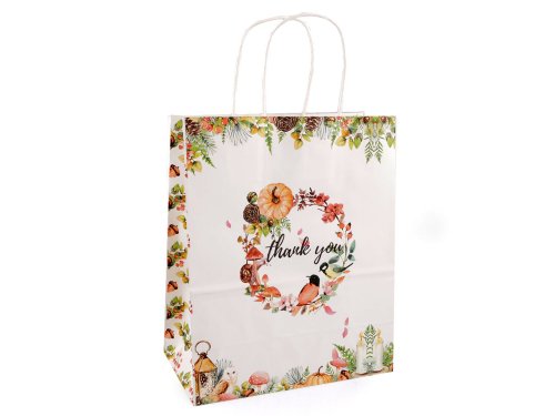 Papierovú darčekovú tašku z oboch strán zdobia obrázky a nápis "thank you". Jej uchá sú krútené a tiež vyrobené z papiera. Taška je vhodná na darovanie darčekov aj na balenie tovaru v predajniach.