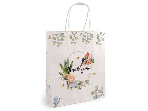 Papierovú darčekovú tašku z oboch strán zdobia obrázky a nápis "thank you". Jej uchá sú krútené a tiež vyrobené z papiera. Taška je vhodná na darovanie darčekov aj na balenie tovaru v predajniach.