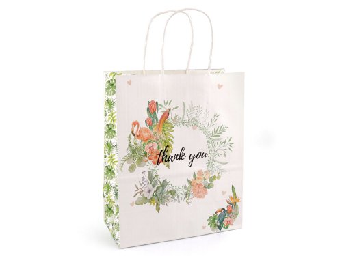 Papierovú darčekovú tašku z oboch strán zdobia obrázky a nápis "thank you". Jej uchá sú krútené a tiež vyrobené z papiera. Taška je vhodná na darovanie darčekov aj na balenie tovaru v predajniach.