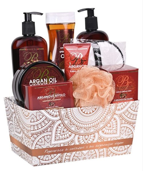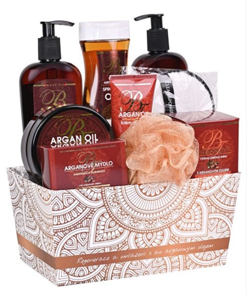 Krásne darčekové balenie kozmetiky s bio arganovým olejom na starostlivosť o pokožku tela i tváre v štýlovej papierovej krabičke. Arganový olej alebo marocký poklad je jedným z najvzácnejších olejov na svete. Prirodzene chráni pokožku, navracia jej pružnosť a jemnosť. Znateľne vyhladzuje drobné vrásky, má skvelé hydratačné, vyživujúce a regeneračné účinky. Možno ho použiť aj na regeneráciu poškodených vlasov a nechtov. Je vhodný pre všetky typy pokožky a pleti. Vďaka svojmu jedinečnému zloženiu je považovaný za prírodný elixír krásy a mladosti. Darčekové balenie obsahuje: