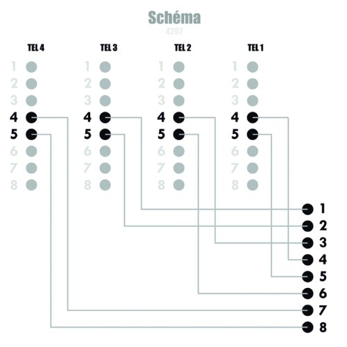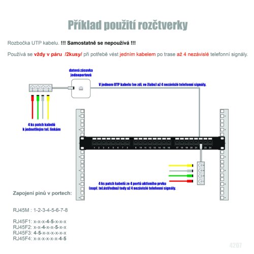 Táto Y rozdvojka dovoľuje rozdeliť jeden port UTP cat.3 kabeláže na štyri samostatné telefónne linky (2 žily) do jedného 4 párového kábla.