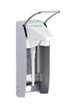Profesionálne pomôcky umožňujúce dávkovanie dezinfekčných prostriedkov, umývacích emulzií a tekutých krémov bez dotyku prstami, ovládanie páky lakťom.