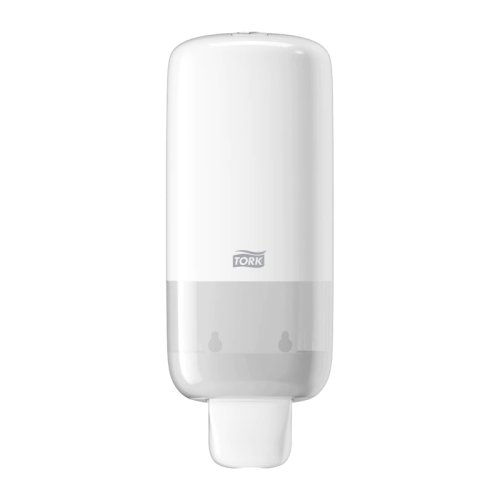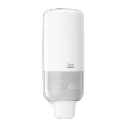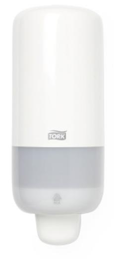 Dávkovač na tekuté mydlo značky Tork S-Box S4 v bielej farbe s obsahom 475 ml a hmotnosťou 0,40 kg má ergonomický dizajn a disponuje tlačidlom na pohodlné použitie.