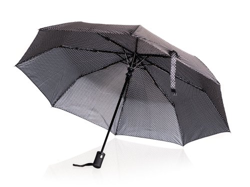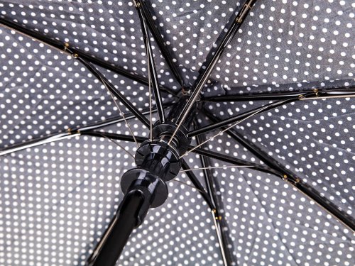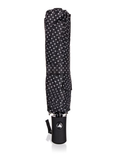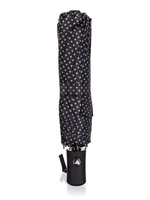Dáždnik skladací 52 cm v čiernej farbe s bodkami, slúži na ochranu proti dažďu a priamemu slnku. Je vyrobený z nepremokavého materiálu polyester. Má ochranu proti poškodeniu vetrom, automatické otváranie a je skladacia pre ľahké uskladnenie.
