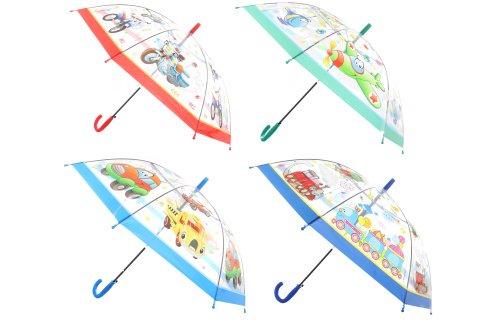 Priehľadný vystreľovací dáždnik s motívmi dopravných prostriedkov. Rozmery rozloženého dáždnika cca 83 x 83 x 65,5 cm. Rozmery balenia cca 65,5 x 9 x 4 cm. Balené v igelitovom sáčku.
