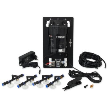 Obsah balenia : rosiaci systém Terrarain2.0, nastaviteľné trysky s prísavkami 4ks, spojovací diel 8ks, ukončovací diel (záslepka), hadica 5m, kovové sitko, sieťový adaptér, rezací nôž, (pozor – nádoba na vodu nie je súčasťou, je možné použiť ľubovoľnú nádrž) .
