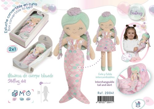 Plyšová bábika OCEAN FANTASY je malá morská víla, ktorej je možné vyzliecť látkový návlek v tvare chvostíka a razom sa zmení na malú slečnu. Táto nová bábika je krásnym doplnkom kolekcie Ocean Fantasy 2021, v ktorej nájdeme najväčší výber výrobkov od cestovných a jedálenských sád cez postieľky a kočíky, až k drevenému nábytku, nielen pre bábiky. Charakteristická je pre ňu svetlo ružová farba so zelinkavými prvkami, pripomínajúcimi kvapky vody a doplnkami podčiarkujúcimi túto morskú rozprávkovú tematiku. Bábika je balená v ozdobnej darčekovej, dômyselne vyrobenej krabičke 2v1 s priehľadným vekom, z ktorej ide veľmi ľahko urobiť pohodlnú kolísku. Bábika je vyrobená z vysoko kvalitného hladkého lesklého plyšu a je prateľná (ručne na 30 ° C). Vďaka svojej veľkosti a ľahučkej váhe je ideálnou spoločníčkou každého malého dievčatka nielen na cestách, ale vďaka mäkkému materiálu je príjemná aj na maznanie do postieľky. Veľkosť 36 cm. Odporúčaný vek 12m+.