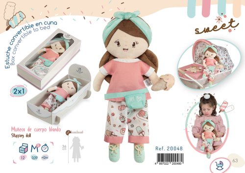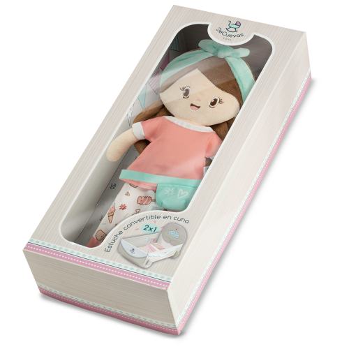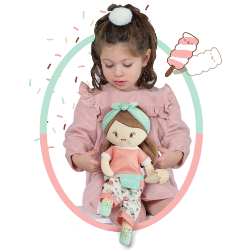 Charakteristická je pre ňu zladená kombinácia farieb lososovej s béžovou a bielej s jemnými motívmi drobných tort, zmrzliniek a muffinov, ktoré pôsobia roztomilo a hravo. Bábika je balená v ozdobnej darčekovej, dômyselne vyrobenej krabičke 2v1 s priehľadným vekom, z ktorej ide veľmi ľahko urobiť pohodlnú kolísku. Bábika je vyrobená z vysoko kvalitného hladkého lesklého plyšu a je prateľná (ručne na 30 ° C). Vďaka svojej veľkosti a ľahučkej váhe je ideálnou spoločníčkou každého malého dievčatka nielen na cestách, ale vďaka mäkkému materiálu je príjemná aj na maznanie do postieľky. Veľkosť 36 cm. Odporúčaný vek 12m+.