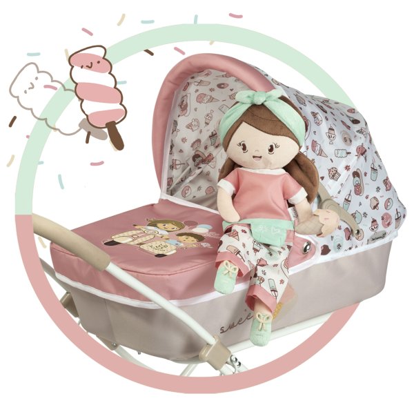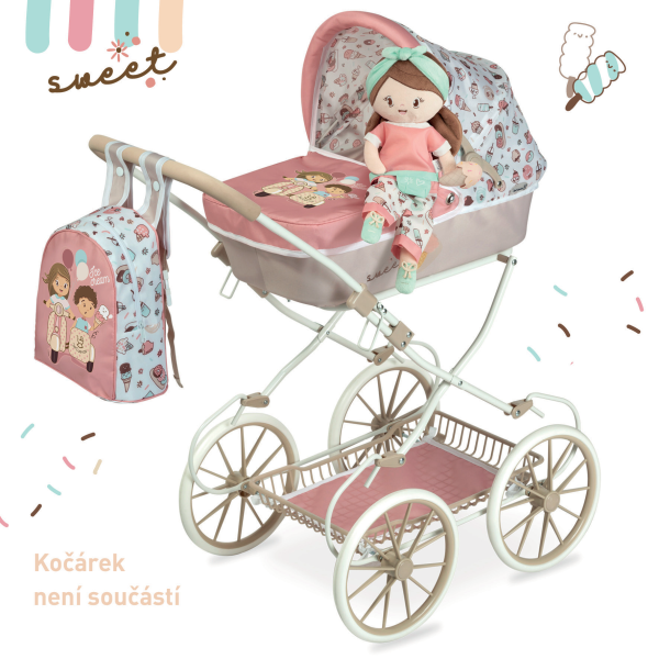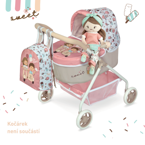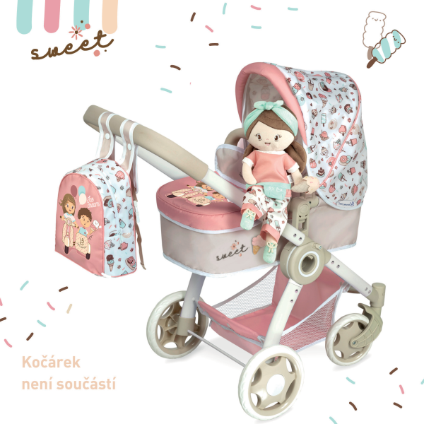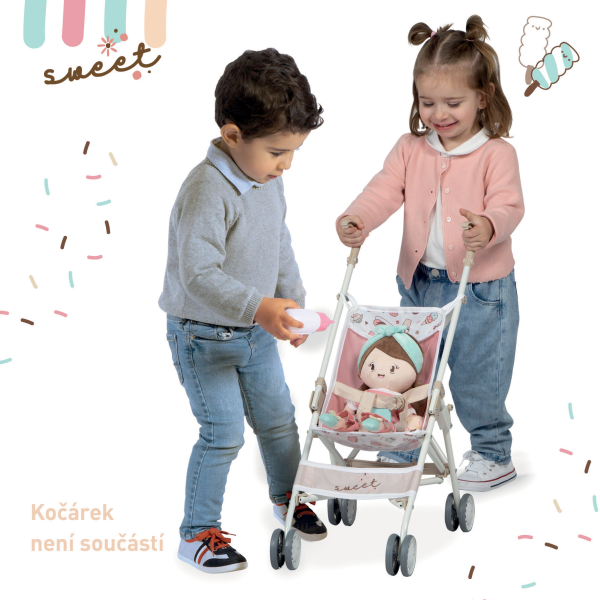 Plyšová bábika SWEET je malá slečna so zmrzlinkou v ruke, patriaca do rovnomennej kolekcie, ktorá je novinkou roku 2022 a ponúka okrem rôznych druhov kočíkov aj ďalšie doplnky pre budúce gazdinky.