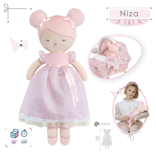 DeCuevas 20146 Plyšová bábika NIZA - 36 cmPlyšová bábika NIZA je malá baletka, patriaca do rovnomennej nežne ružovej kolekcie, ktorá je novinkou roku 2022 a ponúka okrem rôznych druhov kočíkov aj nábytok pre bábiky a malé parádnice. Charakteristická je pre ňu jednofarebná ružová v kombinácii s ružovobielou drobnejšou kockou. Bábika je vyrobená z vysoko kvalitného hladkého lesklého plyšu a je prateľná (ručne na 30 ° C). Vďaka svojej veľkosti a ľahučkej váhe je ideálnou spoločníčkou každého malého dievčatka nielen na cestách, ale vďaka mäkkému materiálu je príjemná aj na maznanie do postieľky. Bábika je balená v igelitovom obale. Veľkosť 36 cm. Odporúčaný vek 12m +. Rozmery balenia 15 x 8 x 36 cm (š xdxv)• Váha balenia: 0,12 kg• Odporúčaný vek od 12 mesiacov