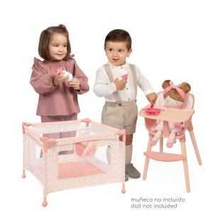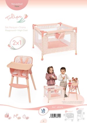 DeCuevas 40074 Nábytkový set pre bábiky 2 v 1 Tulipe 2025 z rovnomennej kolekcie, ktorá je novinkou roku 2025, je vďaka svojim jemným pastelovým farbám krásnym doplnkom dievčenskej izbičky a poteší určite každú malú slečnu. Sada sa skladá z hracej ohrádky pre bábiky, ktoré sa tiež rady hrajú a chcú mať svoje miestečko na oddych, a jedálenské stoličky pre bábiky, ktorá je skvelým pomocníkom pri kŕmení. Tulipe je, ako už sám názov napovedá, kolekcia plná tulipánov v prekrásne zladených teplých pastelových lososových farbách. Svetlejšie a tmavšie odtiene farieb sú vkusne doplnené drobným kvetinovým vzorom v rovnakých tónoch na bielosmetanovom podklade. Tento motív ešte navyše u kočíkov umocňujú svojim tematickým tvarom aj prekrásne, ako tulipán vyzerajúce tašky. Kvet tulipánu zdobia aj drevené výrobky tejto kolekcie. Táto kolekcia ponúka výber výrobkov od jedálenských sád cez postieľky a kočíky až po drevený nábytok pre bábiky. Nádherný španielsky dizajn, precízne spracovanie. Veľmi jednoduchá manipulácia počas samotnej hry. Materiál: kov, plast, textil. Balené v krabici vo farbách kolekcie. Odporúčaný vek od 3 rokov.