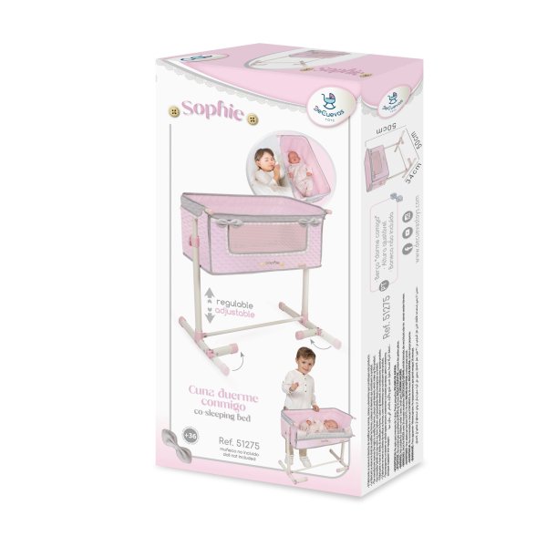 DeCuevas 51275 Novorodenecká postieľka pre bábiky s funkciou spoločného spania Sophie 2025 z rovnomennej kolekcie, ktorá je novinkou roku 2025, určite zaujme predovšetkým touto netradičnou funkciou spoločného spania bábiky a jej mamičky. Toto umožňuje sklápacie bočnice postieľky, polohovacie nohy a nastaviteľná výška lôžko v troch výškových úrovniach. Postieľku je možné vďaka tomu ľahko umiestniť priamo k detskej posteli malej mamičky tak, aby mohla mať svoju bábiku celú noc vo svojej blízkosti, ako to mávajú mamičky, keď si prinesú bábätko z pôrodnice. Nežná dievčenská kolekcia Sophie je neprehliadnuteľná pre každé dievčatko. Svetloružová farba dominuje celej kolekcii. Doplnená je o svetlo šedivé a biele krajčeky a mašličky, ktoré zdobia všetky výrobky tejto rozmanitej kolekcie a ešte viac podčiarkujú nádych romantiky. Kolekcia ponúka nielen spomínané kočíky, ale aj iné doplnky pre malé slečny a ich bábiky. Nádherný španielsky dizajn, precízne spracovanie. Veľmi jednoduchá manipulácia počas samotnej hry. Materiál: kov, plast, textil. Balené v krabici vo farbách kolekcie. Odporúčaný vek od 3 rokov.