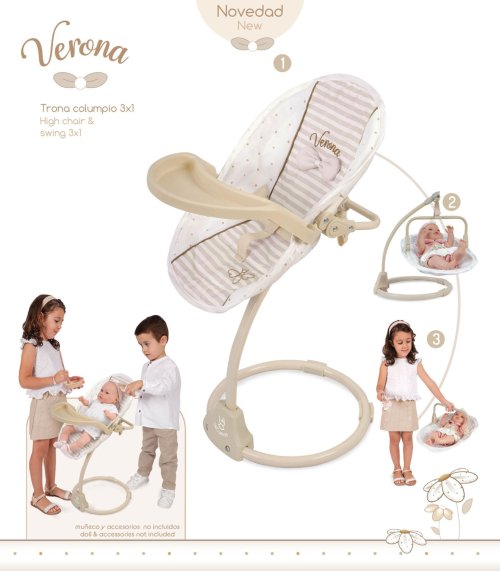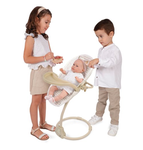 DeCuevas 51578 Multifunkčná jedálenská stolička a hojdačka pre bábiky 3 v 1 Verona 2024 patrí do rovnomennej kolekcie, ktorá je novinkou roku 2024 a ponúka nielen spomínané kočíky, ale aj iné doplnky pre malé slečny a ich bábiky. Táto decentná kolekcia je celá nesená v jemných pastelových prírodných farbách aj vzoroch. Kombinácia svetlo béžovej a bielej s roztomilými bodkami alebo prúžkami dopĺňa svetlo hnedé úzke lemovanie, ktoré zdôrazňuje dokonalosť tvarov a krásne ladí s hnedými madlami kočíkov. Prírodný štýl kolekcie podčiarkujú aplikácie mašličiek zobrazujúce okvetné lístky a drobné výšivky včeličiek. Doplnky a vybavenie: • Odnímateľné obojstranné sedátko-lehátko s bezpečnostnými popruhmi pre uchytenie bábiky, ktoré môže byť vďaka dvom rôznym spôsobom pripevnenia na modernú konštrukciu využité ako jedálenská stolička alebo hojdačka, ale aj samostatne ako nosítko • Odnímateľný plastový pultík na kŕmenie • Rozmery 31 × 30 x 60 cm (dx š xv)• Výška k jedálenskému pultíku: 50 cm • Bábika s doplnkami nie sú súčasťou baleniaDoplňujúce informácie:• Nádherný španielsky dizajn• Precízne spracovanie• Veľmi ľahká manipulácia počas samotnej hry• Materiál: kov, plast, textil • Balené v krabici vo farbách kolekcie• Rozmery balenia: 32 x 10 x 40 (dx š xv)• Váha balenia: 1,24 kg• Pri vybraných modeloch je na obaloch QR kód s video návodom na zostavenie • Odporúčaný vek od 3 rokovDeCuevas 51578 Multifunkčná jedálenská stolička a hojdačka pre bábiky 3 v 1 Verona 2024, z rovnomennej kolekcie, ktorá je novinkou roku 2024. Tá