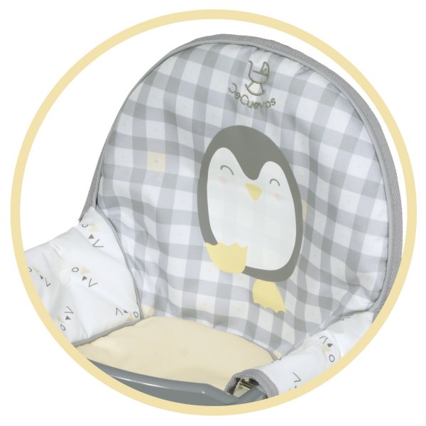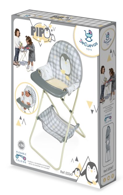 DeCuevas 53247 Skladacia jedálenská stolička pre bábiky PIPO 2022 patrí do rovnomennej kolekcie, ktorá je novinkou roku 2022 a ponúka okrem rôznych druhov kočíkov a nábytku pre bábiky aj ďalšie doplnky pre budúce gazdinky. Charakteristická je pre túto kolekciu šedobiela kocka v kombinácii s jednofarebnými šedivými a bielymi nadrobno vzorovanými časťami a doplnkami v jemne žltej farbe a už spomínaným tučniakom PIPO.