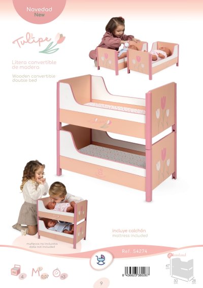 DeCuevas 54274 Postieľka pre bábiky drevená 2 v 1 Tulipe 2025 z rovnomennej kolekcie, ktorá je novinkou roku 2025, je vďaka svojim jemným pastelovým farbám krásnym doplnkom dievčenskej izbičky a poteší určite každú malú slečnu. Poschodová posteľ má výhodu v tom, že sa dá rozdeliť na 2 samostatné postele, kde majú bábiky každá svoje miesto a môžu spať oddelene alebo spoločne, podľa toho, ako si to dieťa praje. Tulipe je, ako už sám názov napovedá, kolekcia plná tulipánov v prekrásne zladených teplých pastelových lososových farbách. Svetlejšie a tmavšie odtiene farieb sú vkusne doplnené drobným kvetinovým vzorom v rovnakých tónoch na bielosmetanovom podklade. Tento motív ešte navyše u kočíkov umocňujú svojim tematickým tvarom aj prekrásne, ako tulipán vyzerajúce tašky. Kvet tulipánu zdobia aj drevené výrobky tejto kolekcie. Táto kolekcia ponúka výber výrobkov od jedálenských sád cez postieľky a kočíky až po drevený nábytok pre bábiky. Nádherný španielsky dizajn, precízne spracovanie. Veľmi jednoduchá manipulácia počas samotnej hry. Materiál: kov, plast, textil. Balené v krabici vo farbách kolekcie. Odporúčaný vek od 3 rokov.