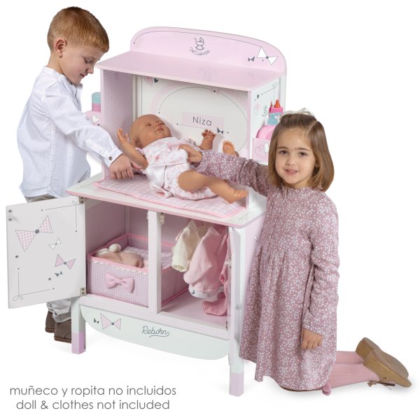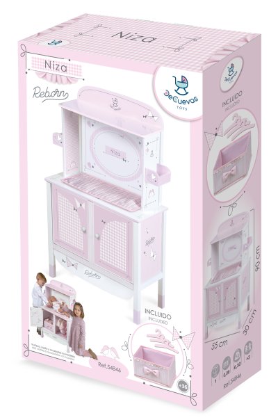 DeCuevas 54846 Drevená šatníková skriňa pre bábiky s hracím centrom NIZA 2022, z rovnomennej nežne ružovej kolekcie NIZA ktorá je novinkou roku 2022, je krásnym a praktickým doplnkom dievčenskej izbičky. Spodná časť skrine slúži ako šatníková skriňa. Tyč s ramienkami a zásuvka poskytnú dostatok priestoru na uloženie oblečkov. Horná časť slúži ako prebaľovacie centrum. Aj tu je však vďaka dvom malým poličkám možné uložiť rôzne doplnky. Kolekcia NIZA ponúka okrem rôznych druhov kočíkov aj nábytok pre bábiky a malé parádnice.