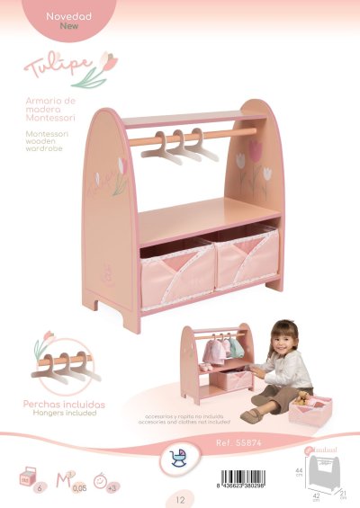 DeCuevas 55874 Drevený šatníkový vešiak na oblečenie pre bábiky Tulipe 2025 patrí do rovnomennej kolekcie, ktorá je novinkou roku 2025 a ponúka výber výrobkov od jedálenských sád cez postieľky a kočíky až po drevený nábytok pre bábiky. Tulipe je, ako už sám názov napovedá, kolekcia plná tulipánov v prekrásne zladených teplých pastelových lososových farbách. Svetlejšie a tmavšie odtiene farieb sú vkusne doplnené drobným kvetinovým vzorom v rovnakých tónoch na bielosmetanovom podklade. Tento motív ešte navyše u kočíkov umocňujú svojim tematickým tvarom aj prekrásne, ako tulipán vyzerajúce tašky. Kvet tulipánu zdobia aj drevené výrobky tejto kolekcie . xhxv)• Oblečenie a doplnky nie sú súčasťou baleniaDoplňujúce informácie:• Nádherný španielsky dizajn• Precízne spracovanie• Materiál: MDF, masívne drevo, kov• Balené v krabici vo farbách kolekcie• Rozmery balenia: 21,6 x 7,2 x 45 cm (dx š xv) • Váha balenia: 3 kg zostavenie • Odporúčaný vek od 3 rokov DeCuevas 55874 Drevený šatníkový vešiak na oblečenie pre bábiky Tulipe 2025 z rovnomennej kolekcie, ktorá je novinkou roku 2025, je vďaka svojim jemným pastelovým farbám krásnym doplnkom dievčenskej izbičky a poteší isto. Šatníková tyč s ramienkami poskytne dostatok priestoru pre u
