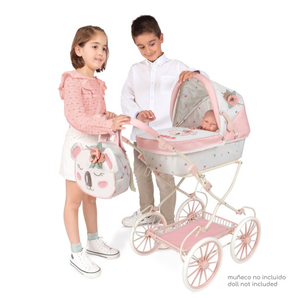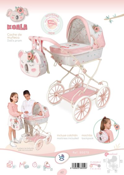 DeCuevas 80079A Skladací kočík pre bábiky s batôžkom KOALA 2025 - 81 cm z rovnomennej, úspešnej kolekcie z roku 2024 je vďaka výškovo nastaviteľnej rukoväte skôr vhodný pre väčšie slečny. Kolekcia ponúka nielen kočíky, ale aj iné doplnky pre malé slečny a ich bábiky. Táto dievčenská kolekcia KOALA je doslova nežnosť sama. Spiaci medvedík s kvetinou za uškom je veľmi roztomilý. Tento motív sprevádza každý výrobok z kolekcie. V prevedení sa strieda biela s drobnou kvetinovou potlačou s lososovo ružovým jednofarebným materiálom. Nádherný španielsky dizajn, precízne spracovanie. Skladací model, veľmi ľahká manipulácia počas samotnej hry. Materiál: kov, plast, textil. Balené v krabici vo farbách kolekcie. Odporúčaný vek od 3 rokov.